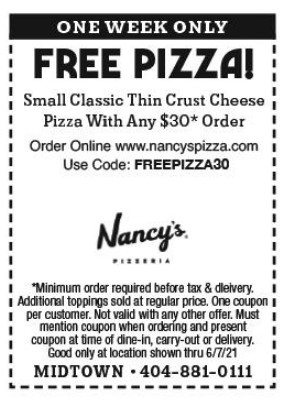 Minimum order required. Use printable coupon or promo code to redeem. Valid only at Nancy's Midtown.