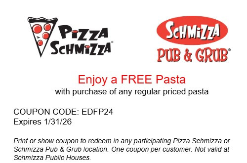 Print or show coupon to redeem in any participating Pizza Schmizza or Schmizza Pub & Grub location. Coupon Code: EDFP24